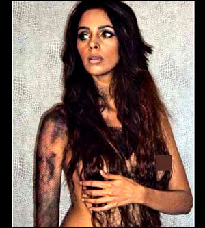Mallika Sherawat continues to make news for her global ‘exposure’. What we mean here is that she is exposing for a Hollywood film – Hisssss where she plays a snake woman. In the latest picture released from the working stills of the film, Mallika Sherawat is wearing nothing on her upper half and is hiding her assets behind the long tresses of her hair. So while posing topless, she very smartly also covers her assets to avoid any censor trouble.