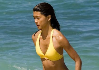 The “Battlestar Galactica” babe gave all the fellas plenty to drool over as she emerged from the ocean in a skimpy yellow bikini while the cameras rolled.